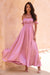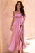 This enchanting off-the-shoulder maxi dress exudes romance and elegance. Featuring delicate ruffle sleeves and a ruched bodice, it beautifully contours the silhouette while offering a comfortable fit. The flowing skirt, complete with thigh-high slits, adds a touch of allure and movement, perfect for any special occasion. Made from a luxurious satin-like fabric, this dress catches the light effortlessly, making it a standout choice for evening events, summer weddings, or dreamy getaways.