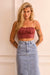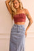 Upgrade your Summer staple with our Walk On Fire Top! Featuring a ruched neck detailing and chunky cute tie back. We love to pair it with our washed denim short for the ultimate weekend look and satin mini skirt for a date night out!